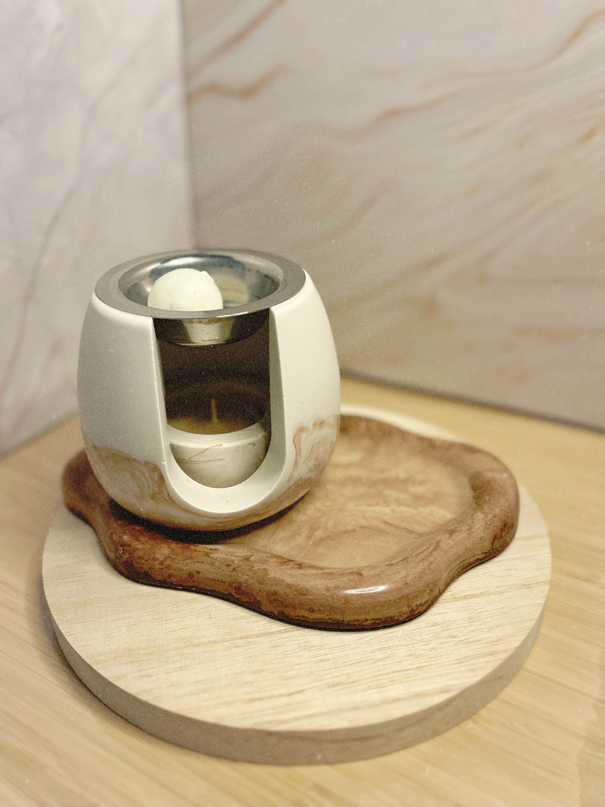 Uma peça elegante em tom marmorizado, criada para transformar qualquer ambiente num refúgio acolhedor. O suporte inclui espaço para vela tealight e um reservatório superior ideal para derreter wax melts, libertando o aroma de forma suave e constante.